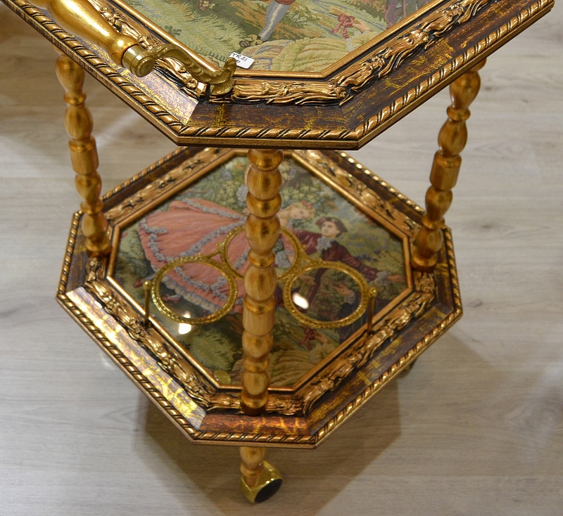 Tutti i carrelli bar sono realizzati con inserti di prezioni e finissimi arazzi tessuti a mano con vari soggetti.